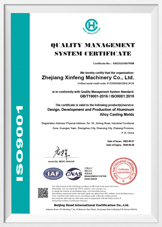 Zhejiang Xinfeng Machinery dan Shengzhou Yuanfeng Mold adalah perusahaan putri dari Yongfeng Mold Group, dengan lebih dari 380 karyawan dan penjualan tahunan 550 juta. Xinfeng specializes in aluminum wheel hub and structural casting molds, covering 30 acres, with a 16,000+ sqm plant, outputting 1,800 sets of molds annually, employing over 130 staff, including 30 skilled technicians and designers using CAD, UG, CATIA, etc. Perusahaan ini fokus pada kebutuhan pelanggan, inovasi, dan kualitas, memaksa sistem kemajuan produksi mold dan disediakan dengan mesin maju seperti pusat CNC.